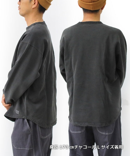 14.1オンスのヘビーウェイト裏毛素材を使用した、存在感抜群のスウェットです。コーマ糸とオープンエンド空紡糸をブレンドし、膨らみ感のある半起毛加工を施すことで、古着のようなヴィンテージ感と柔らかな着心地を実現しました。さらにピグメント染めを採用し、褪せた独特の風合いと深みのある色合いを表現。長く着込むほど味わいが増す1枚です。