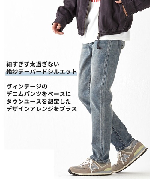 生地にはストレッチ性のあるデニム素材を採用。適度なフィット感と柔らかな穿き心地で、日常使いからアクティブなシーンまで幅広く活躍します。
