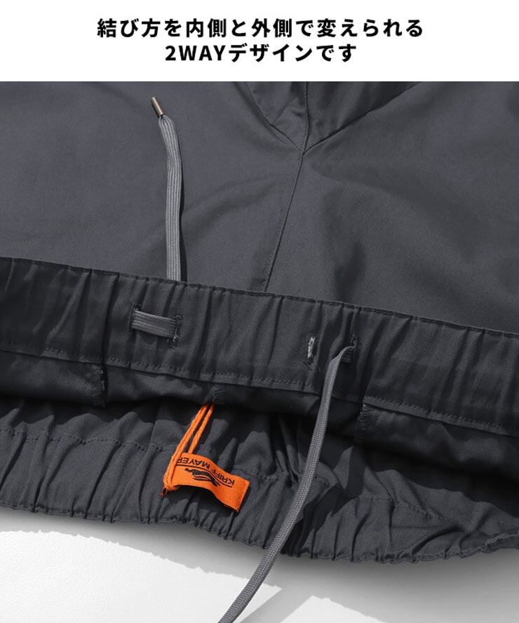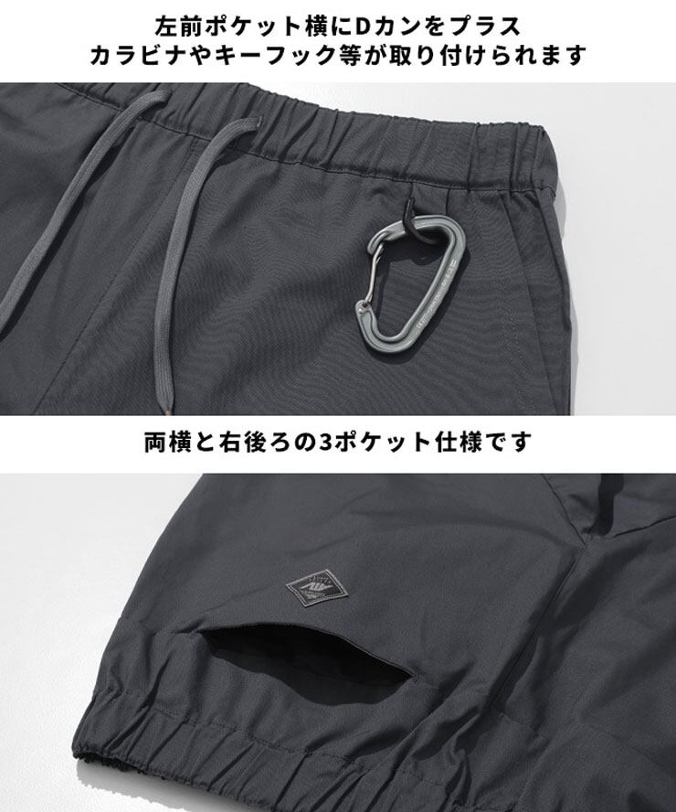 裾にはアジャスターコードを配しており、シルエットの変化を楽しめるのもポイント。さらにウエスト部分には便利なDカンを装備し、カラビナやキーなど小物の取り付けに役立ちます。普段のカジュアルコーデはもちろん、キャンプ・フェス・軽登山などのアクティブシーンでも活躍間違いなしです。