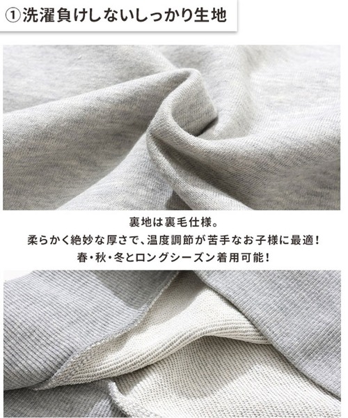 しっかりとした裏毛素材を採用しており、洗濯してもヨレにくく耐久性抜群。吸水性に優れているため、汗をかきやすいお子様や温度調節が苦手なお子様にも快適な着心地を提供します。適度な厚みでインナーを重ねてもゴワつかず、秋冬のデイリーウェアにぴったりです。
