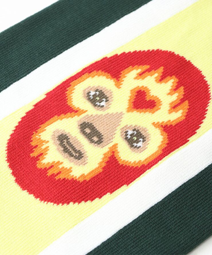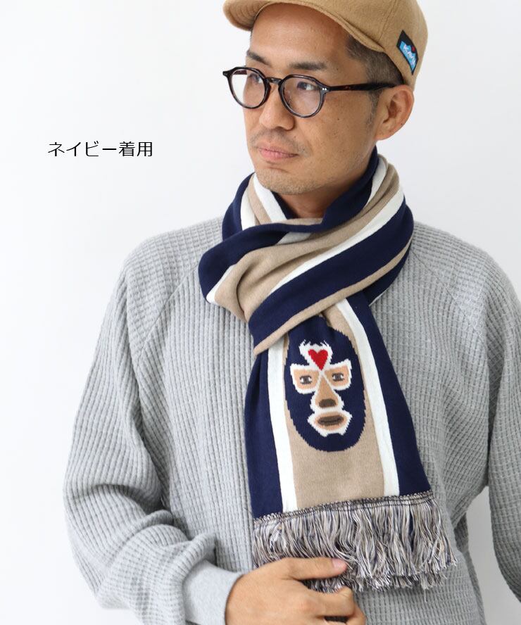 覆面レスラーとブランドロゴを組み合わせた、遊び心あふれるジャガードマフラー。両面リバーシブル仕様で、その日の気分やコーディネートに合わせて使い分け可能です。