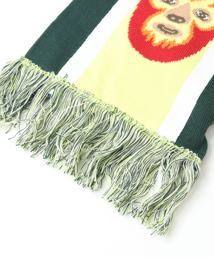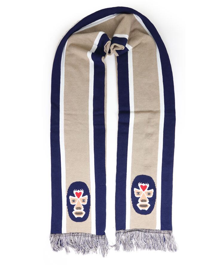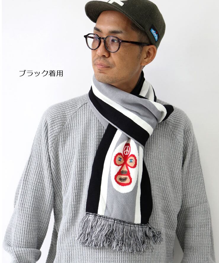覆面レスラーとブランドロゴを組み合わせた、遊び心あふれるジャガードマフラー。両面リバーシブル仕様で、その日の気分やコーディネートに合わせて使い分け可能です。