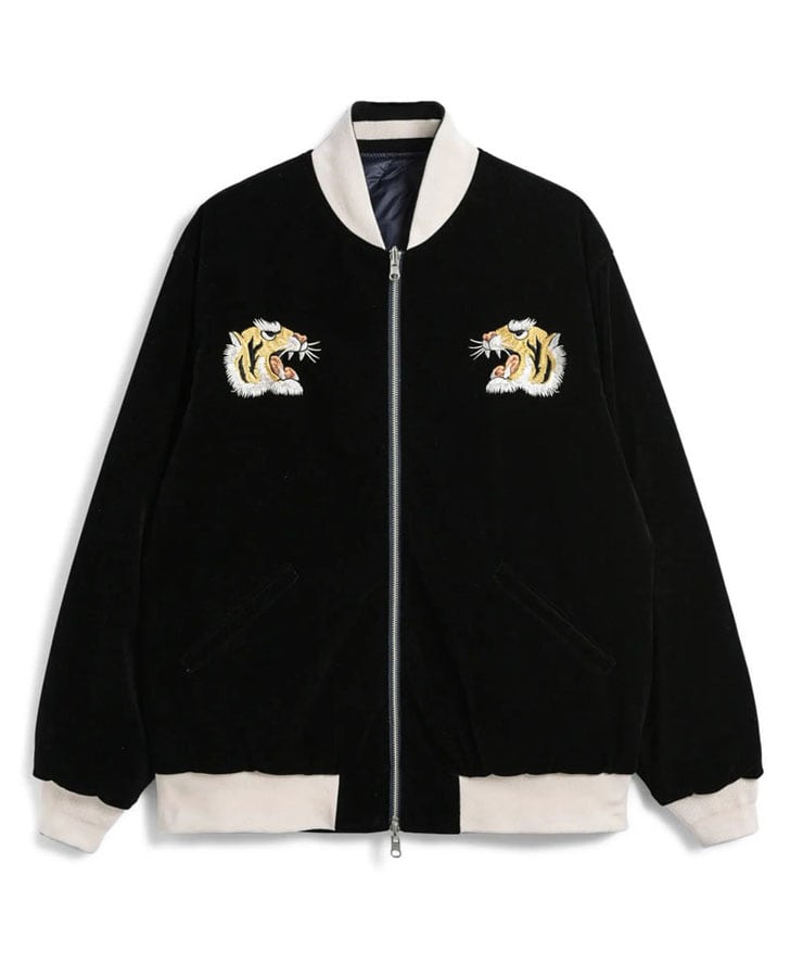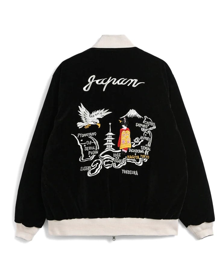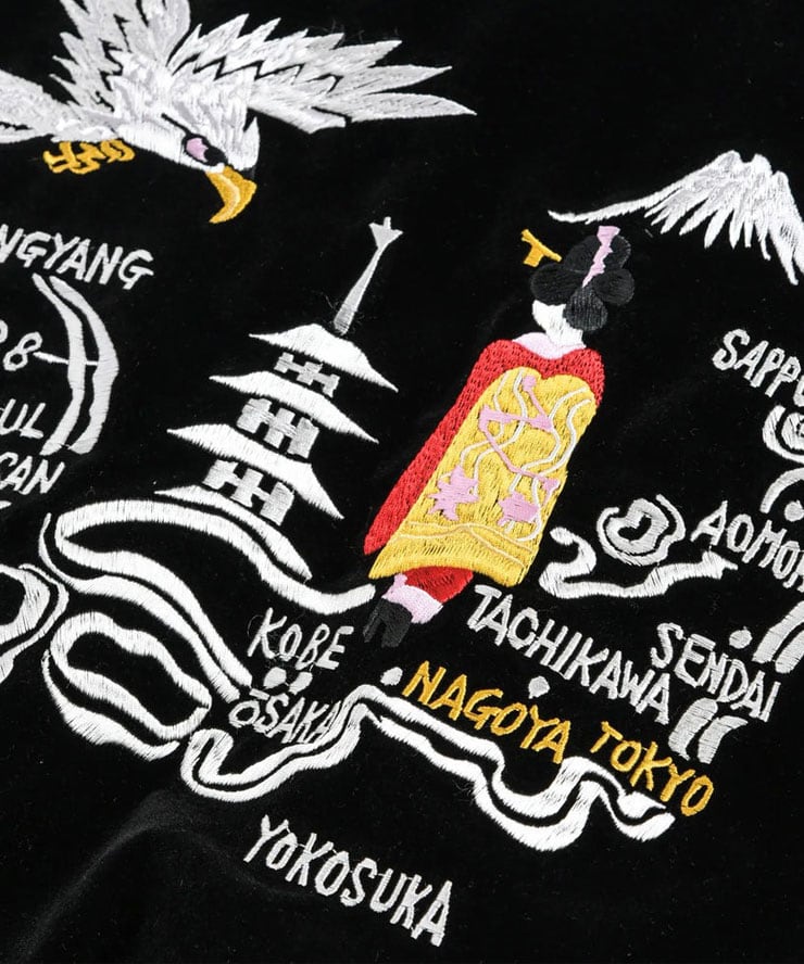 Velour Sukajan side: Features luxurious velour fabric with intricate embroidery for a standout, vintage-inspired look.
