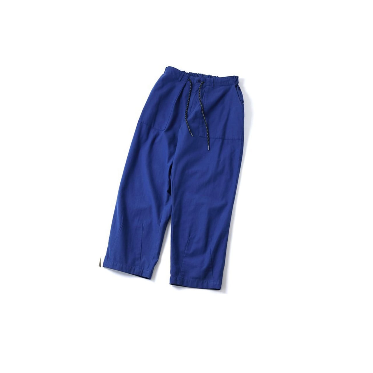 生地にはパッカリング加工を施すことで立体的なアタリを表現。フロントにタックを入れ、裾をすぼめたデザインにより、リラックス感がありながらも美しいシルエットを実現しました。ウエストはゴム仕様に加え、フロントZIPと紐、ベルトループも備え、着脱のしやすさと調整力を両立。