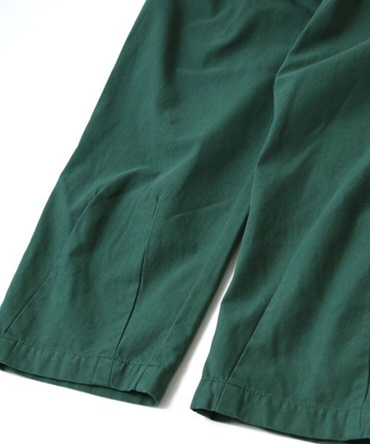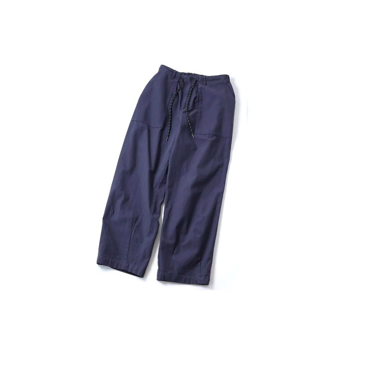 生地にはパッカリング加工を施すことで立体的なアタリを表現。フロントにタックを入れ、裾をすぼめたデザインにより、リラックス感がありながらも美しいシルエットを実現しました。ウエストはゴム仕様に加え、フロントZIPと紐、ベルトループも備え、着脱のしやすさと調整力を両立。