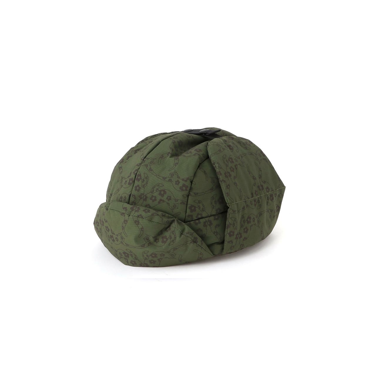 ジムマスターらしい総柄リップストップ生地を使用した中わた入りフライトキャップ。