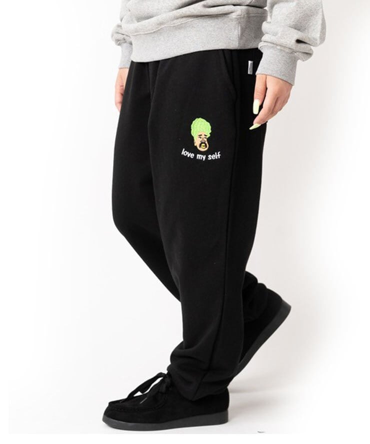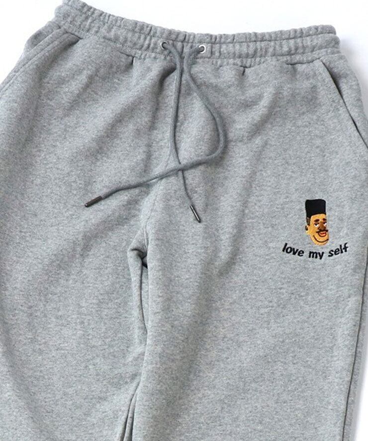 ポケットに「LOVE MY SELF」と刺繍をあしらった、ジムマスターらしい遊び心とメッセージ性を兼ね備えたスウェットパンツ。