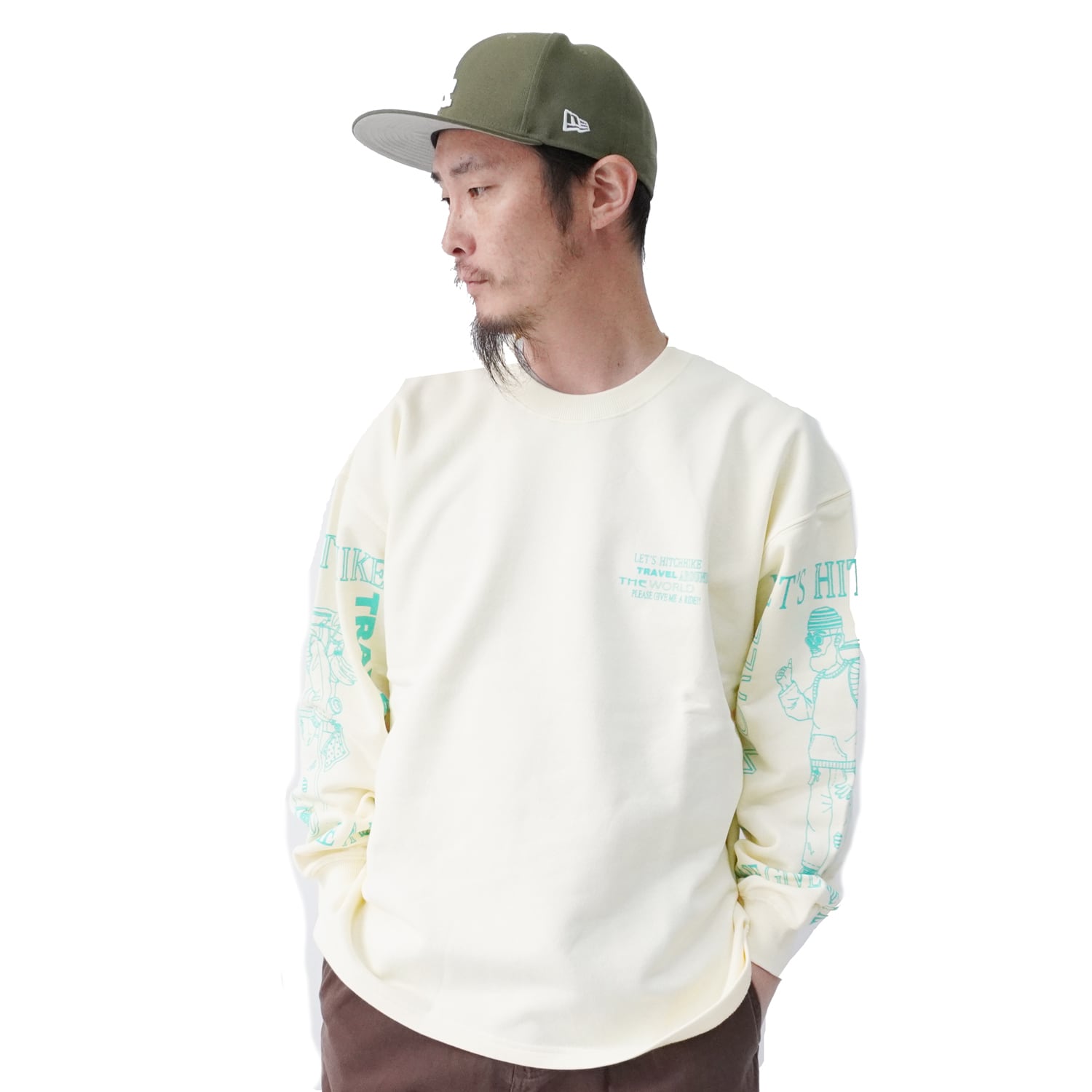 フロントはシンプルなワンポイントロゴ、両腕には特徴的なヒッチハイカーおじさんプリントを配置し、落ち着いたカラーリングの中に遊び心が光るデザインです。
