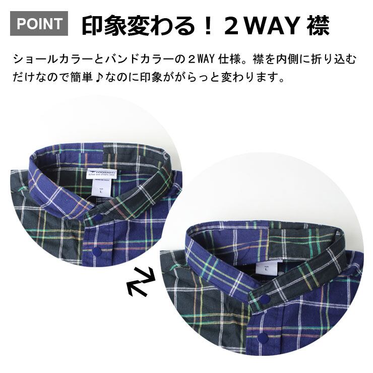 ショールカラ―でも、襟をインすればバンドカラーとしても使える 2WAY仕様の襟が魅力のショールカラーシャツ。 サラッと着こなせる生地を採用。ラウンドした襟が上品な印象です。 タウンユースにもオフィスカジュアルにも合わせれます。 袖口はリブ使用になっているので機能的です。 夏には薄手の羽織りとしても使えます。