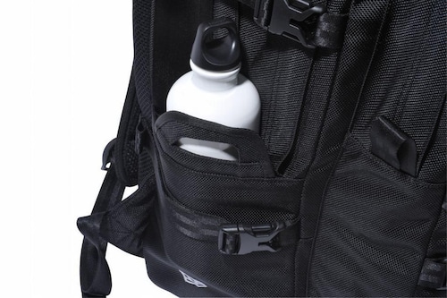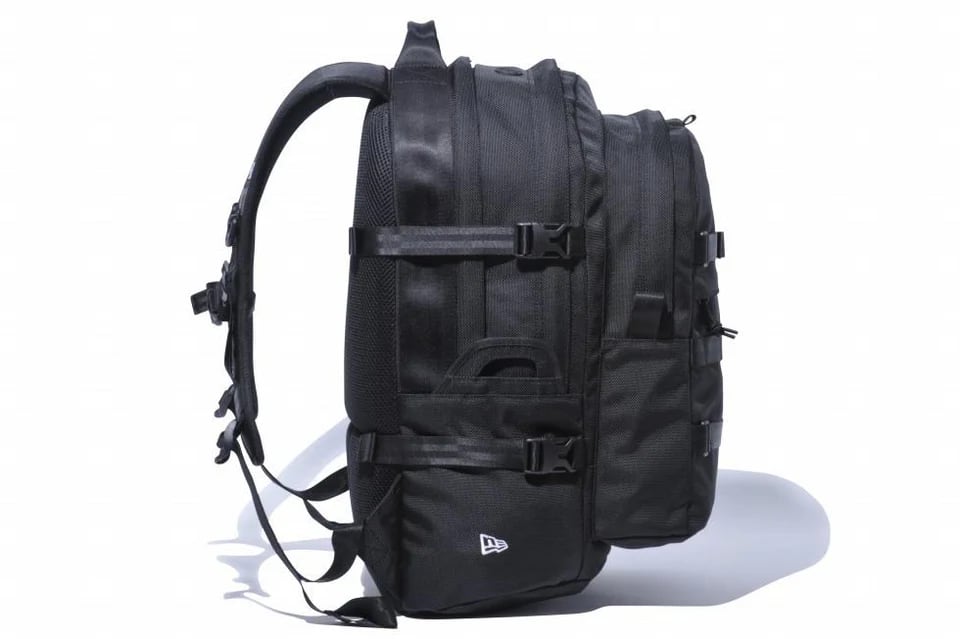 両サイドにはドリンクや折りたたみ傘の収納に便利なポケットを配置。外側のストラップを使えば、スケートボードなどを固定して持ち運びが可能。ニューエラの別売り「キャップキャリア」もそのまま収納できる設計です。