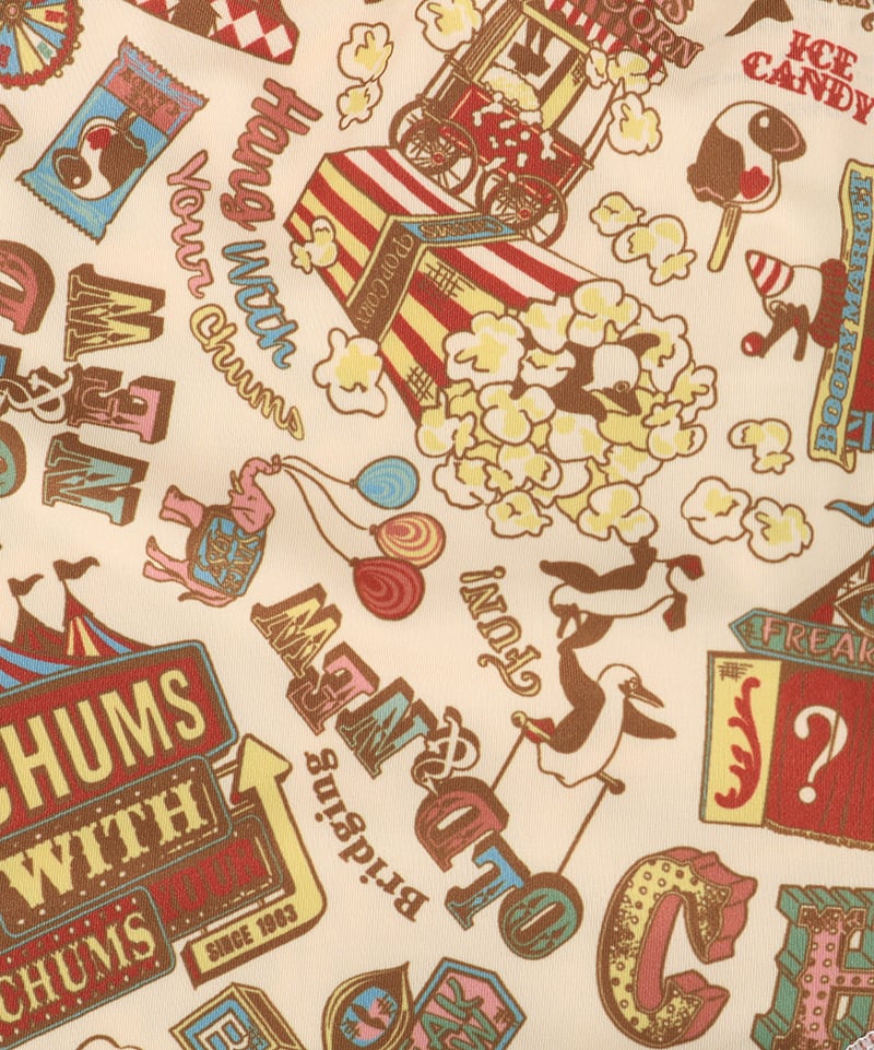 前開き仕様&CHUMSロゴのウエストゴムなど、デザイン性と実用性を両立しています。