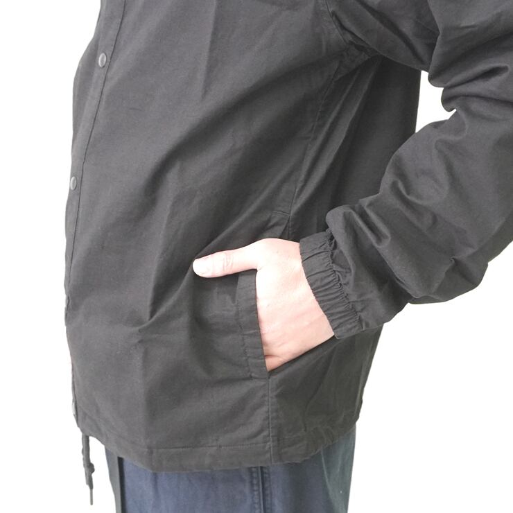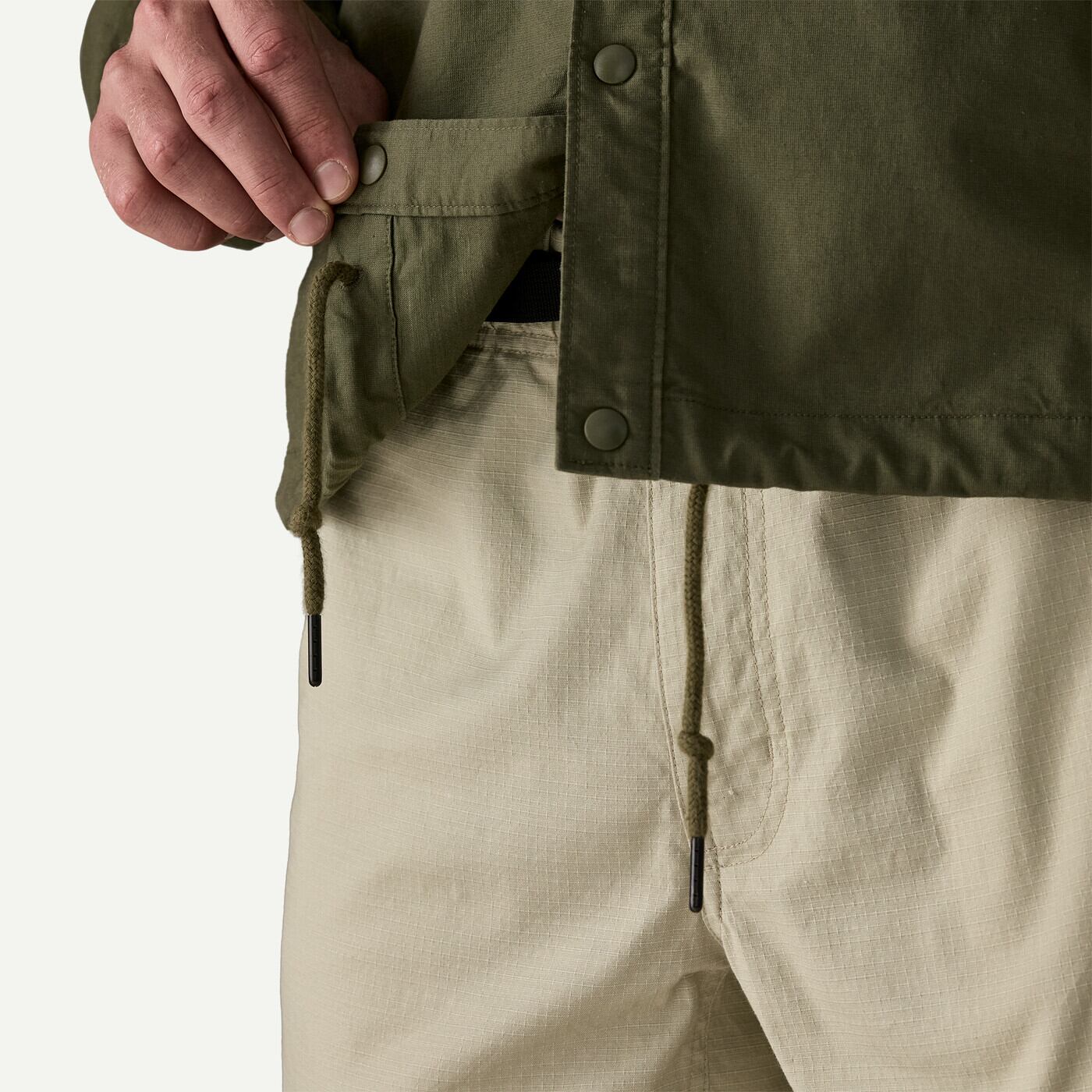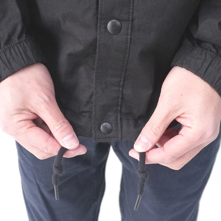 フロントはスナップ留め仕様で、着脱もスムーズ。フラットに開く襟は首元に快適にフィットします。袖口は伸縮性を備え、さっと羽織れるイージーな設計。ストレートな裾はドローコードでフィット感を調整可能です。