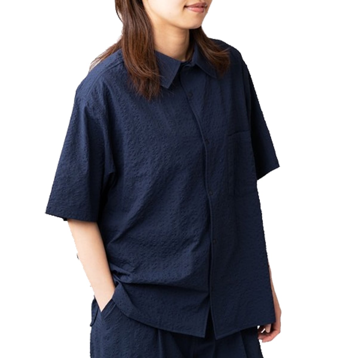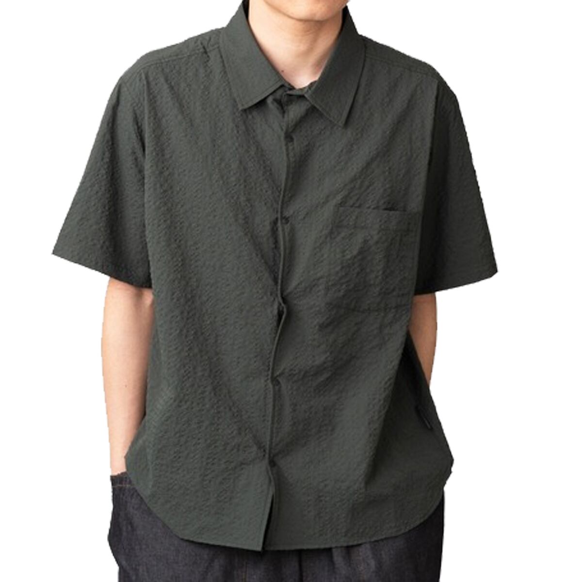 表面にランダムな凹凸(シボ)があるシアサッカー生地は、肌との接触面が少なく、汗ばむ季節でもベタつきにくく快適な着心地。さらにポリエステル100%素材により、軽さ・速乾性にも優れており、アウトドアや日常使いまで幅広く対応します。