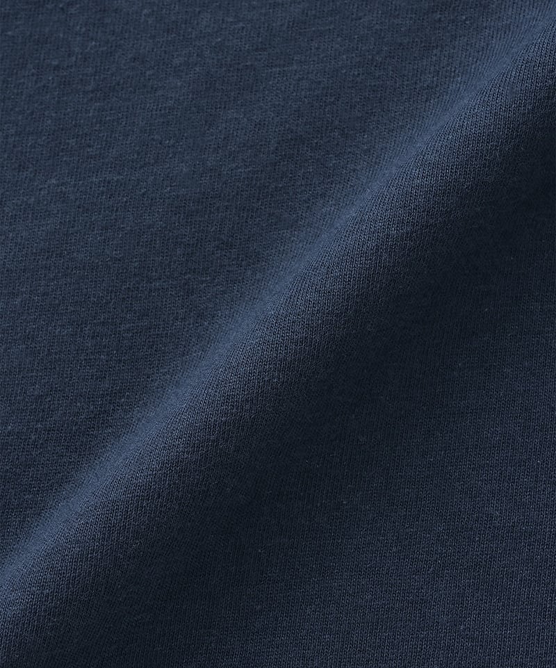 素材にはリサイクルコットンを使用。紡績工程で生まれる落ち綿や余剰糸を再利用し、コットン本来の風合いを活かしながら環境負荷を抑えたサステナブルな素材です。肌触りも良く、春夏シーズンでも快適な着心地を実現しています。