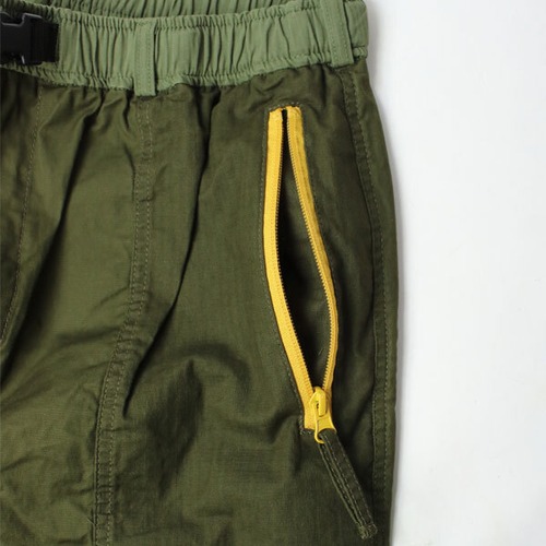 異素材生地のグラデーションで見せる ロングパンツ。 素材感の違うヘリンボーン/ピケ/リップストップを 組み合わせることでエッジの利いた仕上がりに。 ポップな配色でジップのカラーもポイントになっています。 スタイルはテーパードで使いでスッキリと見えるシルエットになっています。
