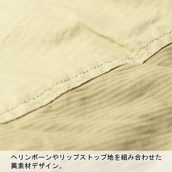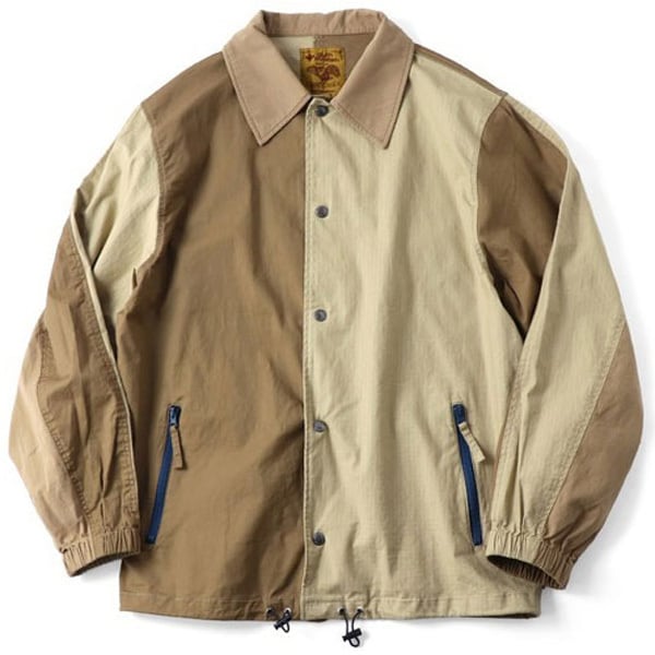 異素材生地のグラデーションで見せる コーチジャケット。 素材感の違うヘリンボーン/ピケ/リップストップを 組み合わせることでシンプルなコーチジャケットが エッジの利いた仕上がり。 ポップな配色でジップのカラーもポイントになっています。