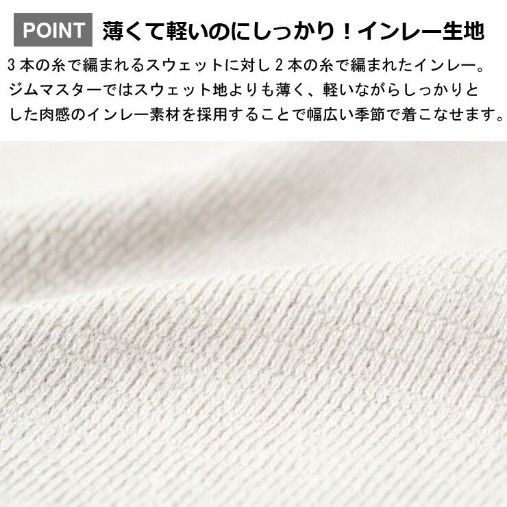 3本の糸で編まれるスウェットに対し2本の糸で編まれたインレー。 ジムマスターではスウェット地よりも薄く、軽いながら しっかりとした肉感のインレー素材を採用することで 季節にとらわれず使いやすいロンTEEを作りました。 裾はリブ仕様で、アウターにも合わせやすいジャストサイズ。 シンプルでスッキリとした印象で着用いただけます。