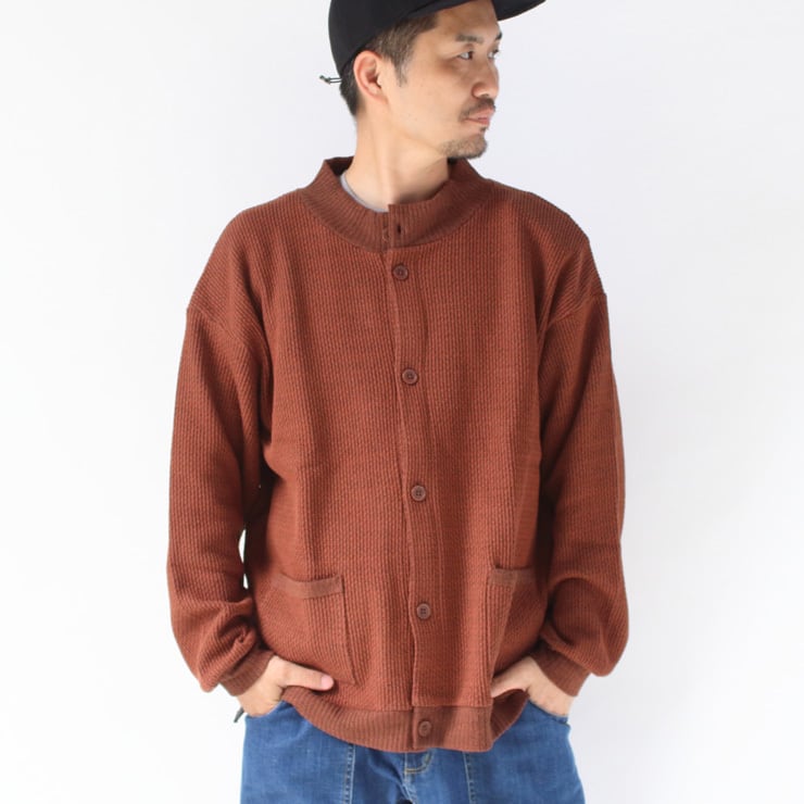 凹凸感ある生地が魅力の スタンドカーディガン。 粗めのコットン鹿の子素材は、 一見ゴツゴツした厚めの素材でに見えますが、 通気性とナチュラルな肌触りがポイント。 ほどよい肉感で、ワッフルニットのような風合いです。 MIX調の糸で編まれているので 生地に表情が出るのもポイント。 首元は、低いスタンドネックでリブ仕様。 袖、裾もリブで、フロントはスナップボタン 使い易く、留めても、フルオープンでも決まります。 ゆる編みなので風通しがよく、 重ね着してもアツすぎません。 秋から春まで重宝できるアイテムです。