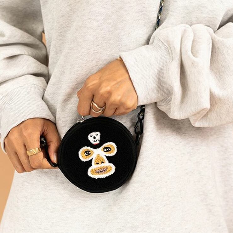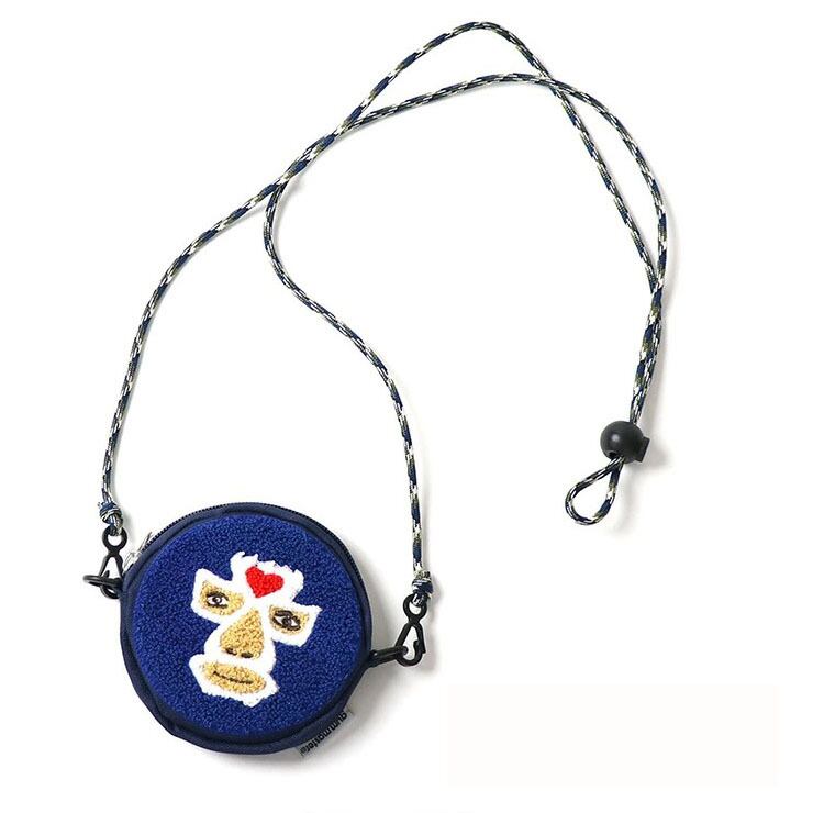 サガラ織りの覆面レスラーの丸顔はそのままポーチとしても使用でき、ショルダーをつければ、ミニショルダーバッグとしても 着用できる2WAY。