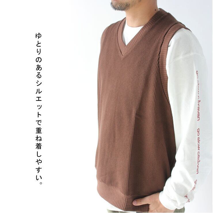 ゆったりとしたシルエット、 粗い編み生地の凸凹感があるワッフル素材のベスト。 Tシャツに・シャツに+1 季節の変わり目に最適です。 単色タイプと、裏表とリブが配色になった クレージーパターンの展開となっております。 アームホールは大きめでざっくりなので ビックTEEとの相性も◎