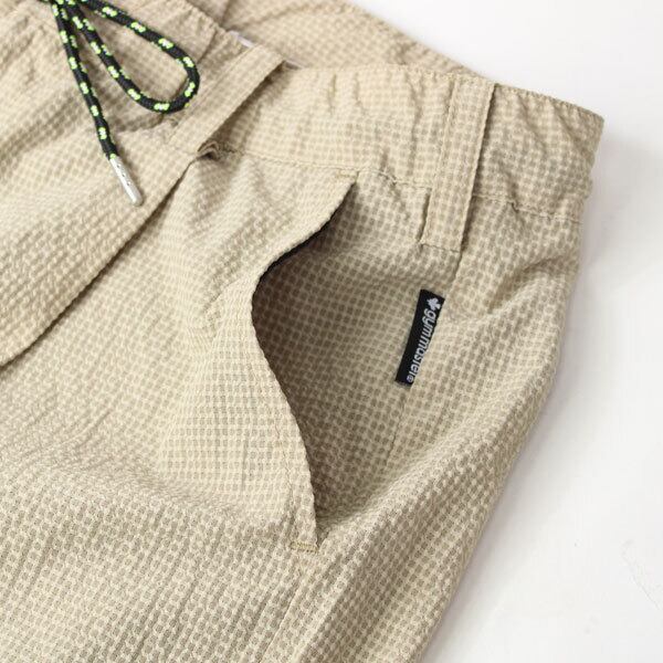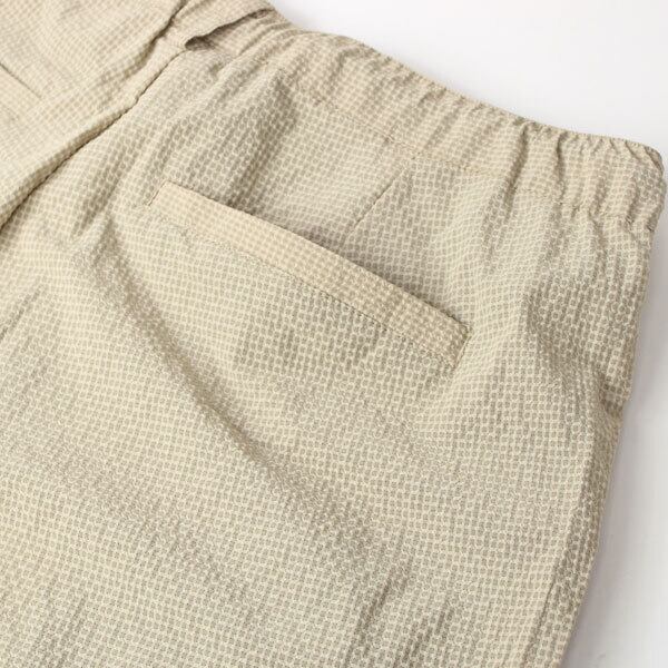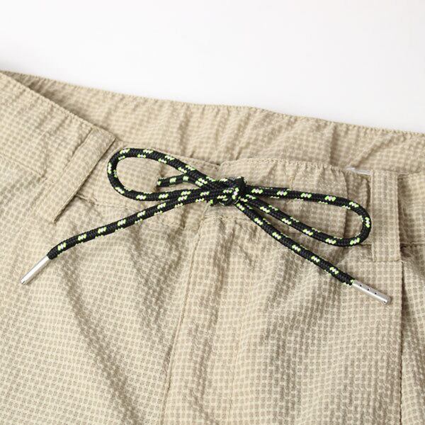 ウルトラライトな シアサッカーロングパンツ。 シアサッカーは、ふっくらとしたしぼにより、 ふんわりとした優しい肌触りと清涼感が魅力。 表面が凹凸になっているので、 生地が肌に触れる面積が少なく、肌と生地の間に 空間ができるため通気性良く着心地が快適です。 さらに、 ポリエステル素材なので、軽量、速乾性にも優れいています。 サイズ感テーパードながら フロントにタックがはいっているので窮屈感を感じず、 リラックス感のあるシルエットで着ていただける ゆとりのあるシルエットとなっています。