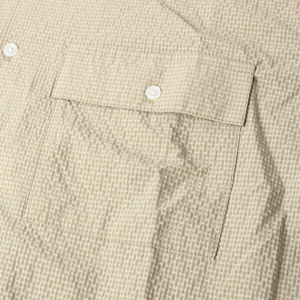 ウルトラライトな シアサッカーワークシャツ。 シアサッカーは、ふっくらとしたしぼにより、 ふんわりとした優しい肌触りと清涼感が魅力。 表面が凹凸になっているので、 生地が肌に触れる面積が少なく、肌と生地の間に 空間ができるため通気性良く着心地が快適です。 さらに、 ポリエステル素材なので、軽量、速乾性にも優れいています。 大きめのフラップ付きの胸ポケットもポイント サイズ感ゆるーくらくに着ていただけます。