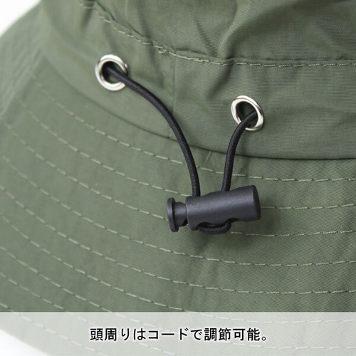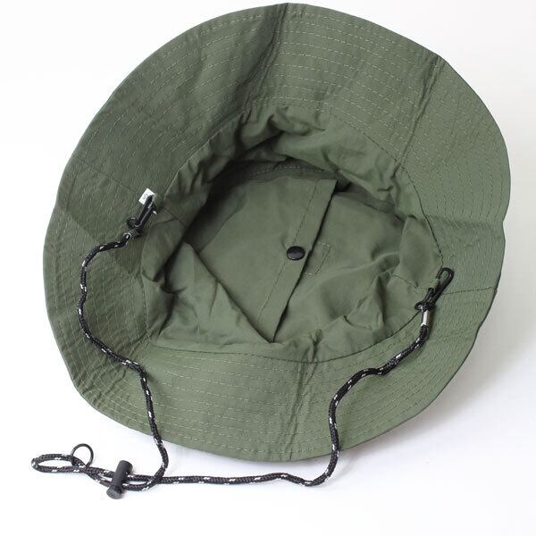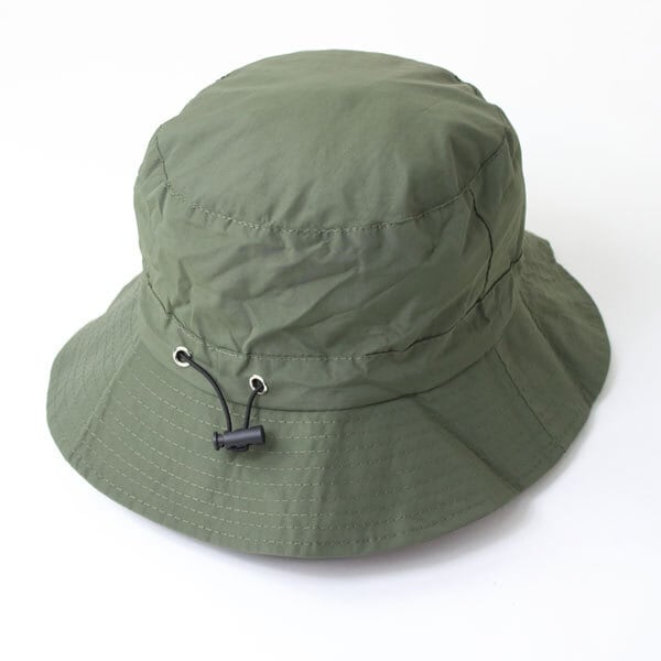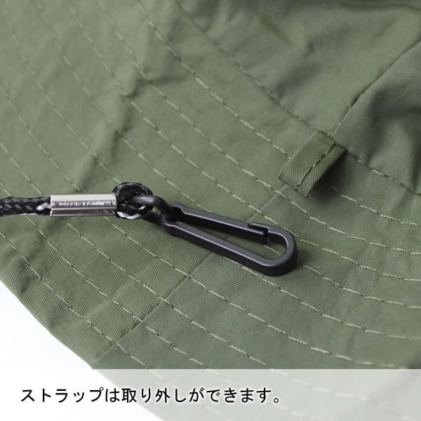 ナイロン素材のバケットハット。帽子の内側がポケットのようになっており、裏返すように収納すれば丸くて小さい形になって持ち運びやすくなります。フック付なのでカバンなどにつけることも可能♪