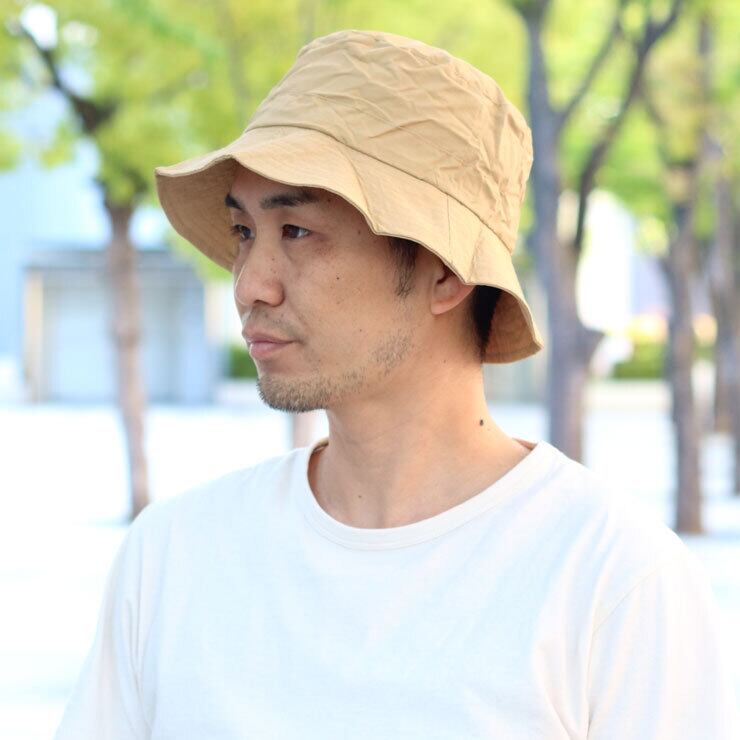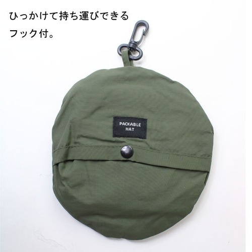 ナイロン素材のバケットハット。帽子の内側がポケットのようになっており、裏返すように収納すれば丸くて小さい形になって持ち運びやすくなります。フック付なのでカバンなどにつけることも可能♪