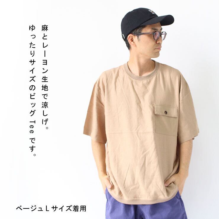 素材に拘ったから麻とレーヨンを使ったクルーネックTシャツ。 レーヨン特有のさらっとした着心地と、夏でも涼しい麻素材を採用。 ネック周りと裾がリブになっているので、着脱しやすくなっています。 リラックス・心地よさを追求。 ドロップショルダーになるようなやや ワイドなシルエット素材感を生かした ゆとりのあるサイズ感になっています。 フラップ付きの胸ポケットは同系色の別素材でポイントに。 セットインスリーブになっているのでオフィスカジュアルにも使えそうです。