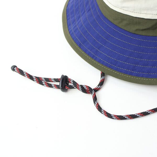 水をはじき、汚れに強いナイロン素材でアウトドアにぴったり。ベンチレーションがあるので内に空気がこもりにくく快適なかぶり心地です。取り外しができるあごひもがついていて便利。頭周りにコードが通っており、後頭部でサイズ調節が可能です。