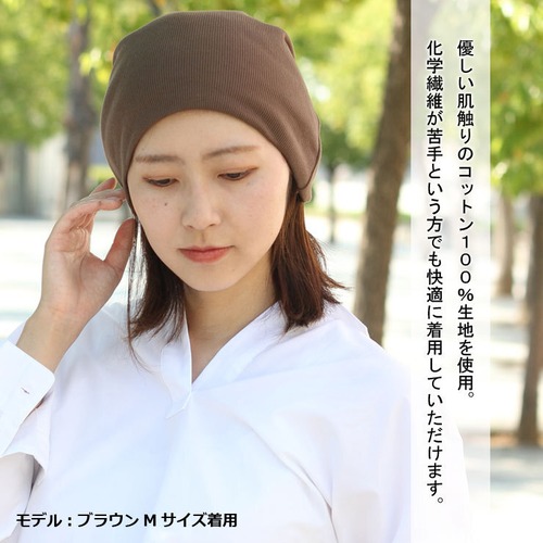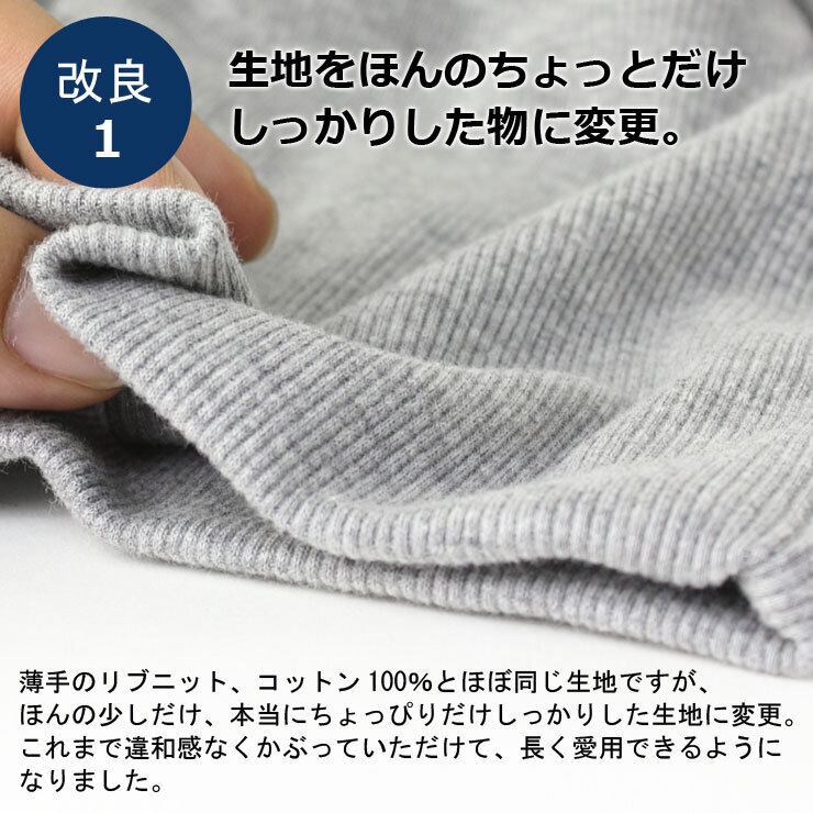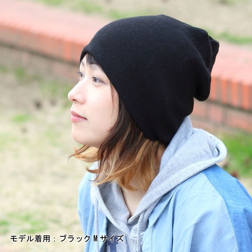 薄手のリブニット、コットン100%と少し触った感じでは改良前とあまり変わらないと思われるかもしれません。しかし、かぶっていただければ「柔らかさはそのままでほんの少ししっかりした」かぶり心地がわかっていただけると思いますし、今まで愛用していただいた方も違和感なくかぶっていただけると思います。