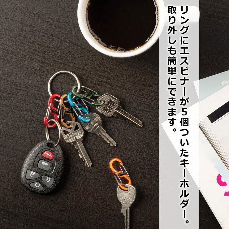 リングにカラフルなSビナーが5つついており、取り外しやすいのでカギの管理にぴったり。