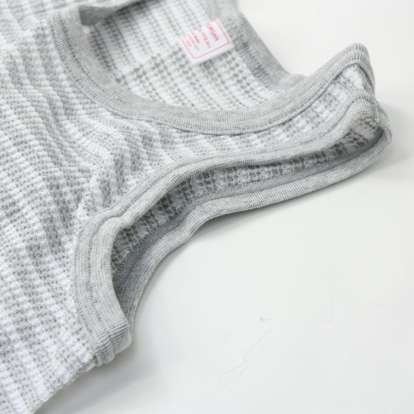 ブランドを象徴するサーマルのパック入りタンクトップ。伸縮性が良く、さらっとした肌触りのワッフル地を使用。スッキリとしたシルエットで裾を緩やかにラウンドさせたデザインは、夏のメインアイテムとして1枚でも、秋冬から春はインナーとしても使い易いアイテムです。カジュアルな雰囲気のボーダー柄がお洒落。