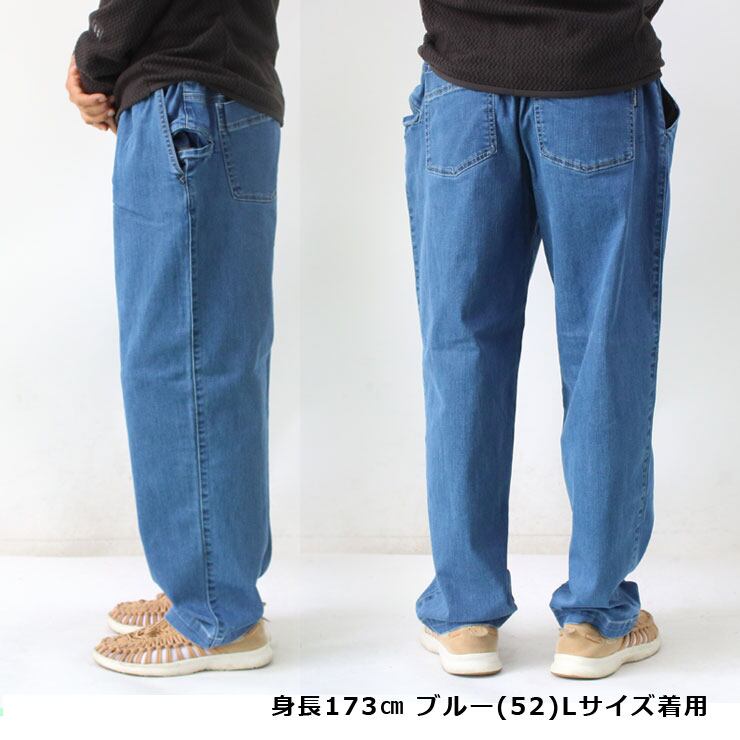生地は伸縮性に富んだストレッチデニム。 着心地もよく、アウトドアに最適な股にマチのあるクライミングパンツ仕様! ウエストはウェービングベルトなので脱ぎ履き楽ちんです。