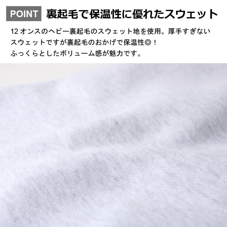 12オンスのヘビースウェット生地:しっかりとした厚みで型崩れしにくく、綺麗なシルエットをキープ
