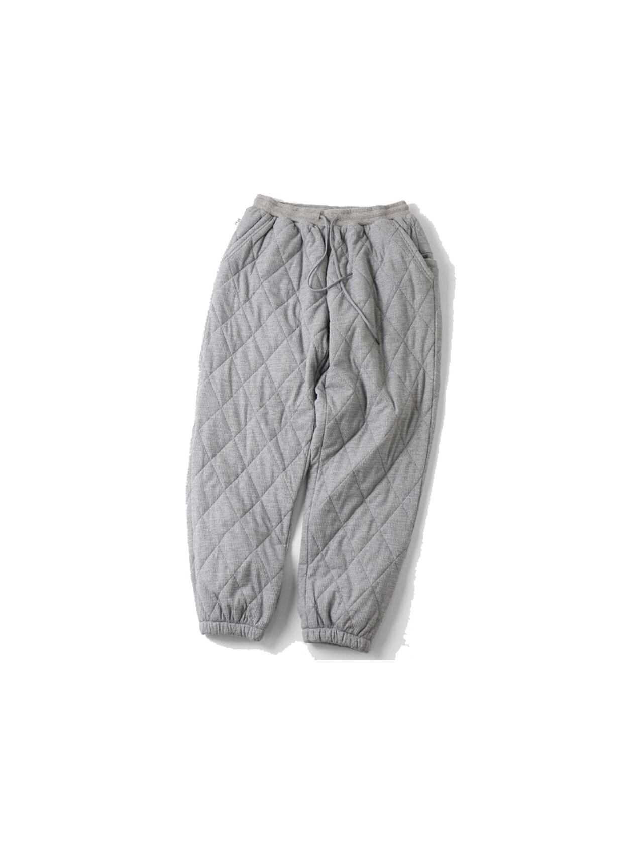 デコボコのあるワッフル素材を表面に キルティングにした風合いのあるイージーパンツ。 ややゆるめのリラックス感あるシルエットがポイント。 薄手の中綿キルティングなので 一枚でも保温性を確保できるアイテムです。 ウエストはひもなのでルームウエアとしても、お散歩や サイクリングシーンにもストレスなく着て頂けます。