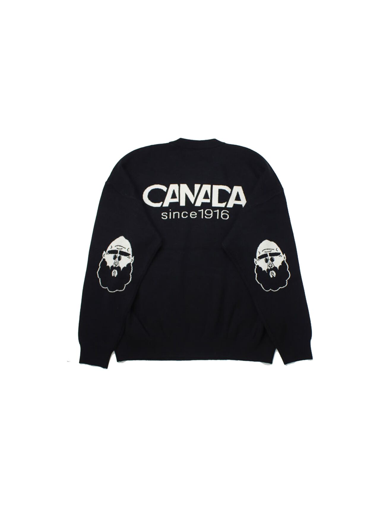 これからの季節にぴったりのニット。ゆったりシルエットで着心地らくちん♪ シンプルなフロントのロゴマークと見せかけて ひじにはジャガード織りのおじさんのエルボーパッチをあしらった人気のデザイン。 後ろにはCANADAとこれまたシンプル。 メンズ・レディースともにおすすめのデザインです。
